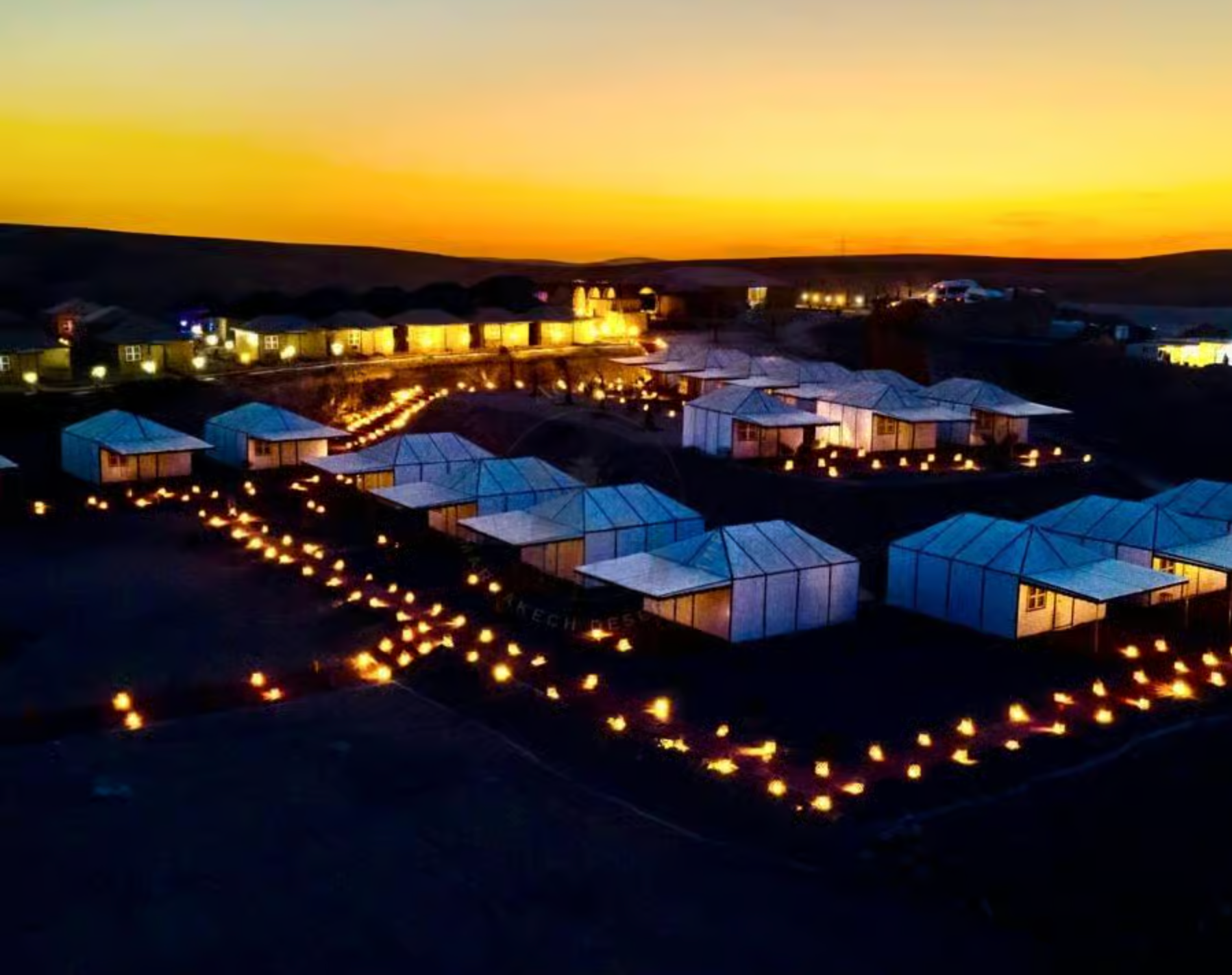 Vive una experiencia única pasando una noche en el desierto de Agafay, a solo unos kilómetros de Marrakech. Dormirás en una tienda privada bajo un cielo lleno de estrellas, disfrutarás de una cena especial de varios platos y asistirás a un espectáculo tradicional marroquí junto a la fogata.